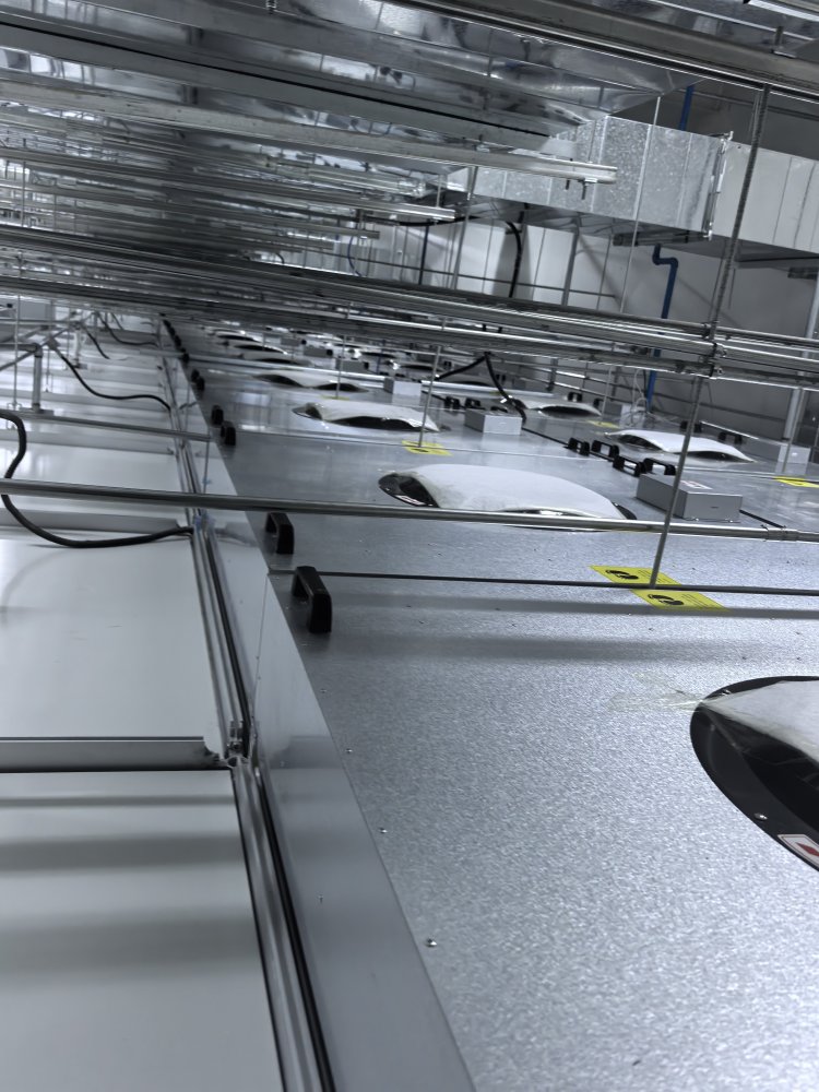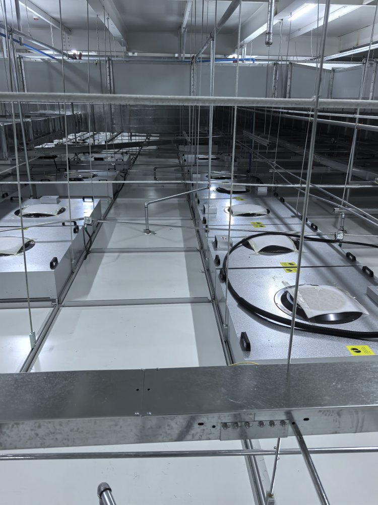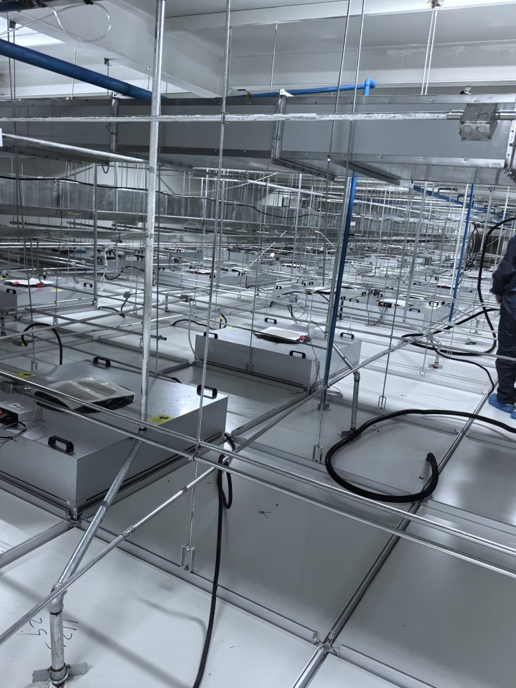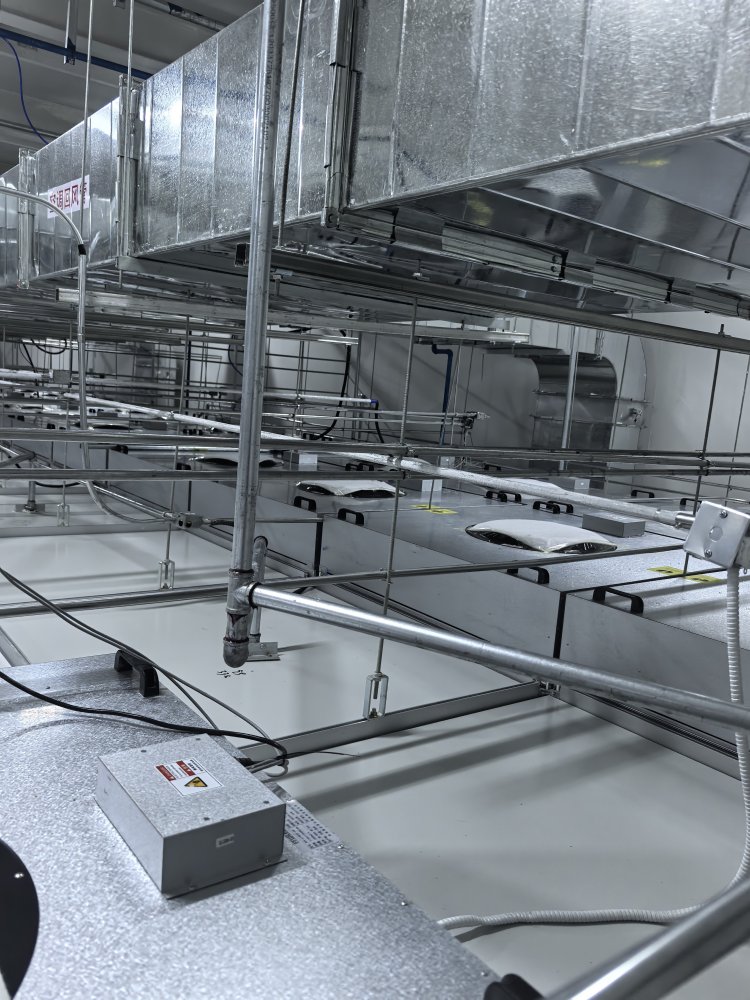 项目实施期间,荣亦信组建专业技术团队,克服工期紧、现场施工复杂等难题,严格遵循洁净工程规范,高效完成设备吊装、布线、安装及单机、联动调试。经全面检测,所有 FFU 运行参数达标,车间洁净度、风速均匀性、噪音控制等核心指标均优于合同约定标准,顺利通过宝昂新材料的验收。